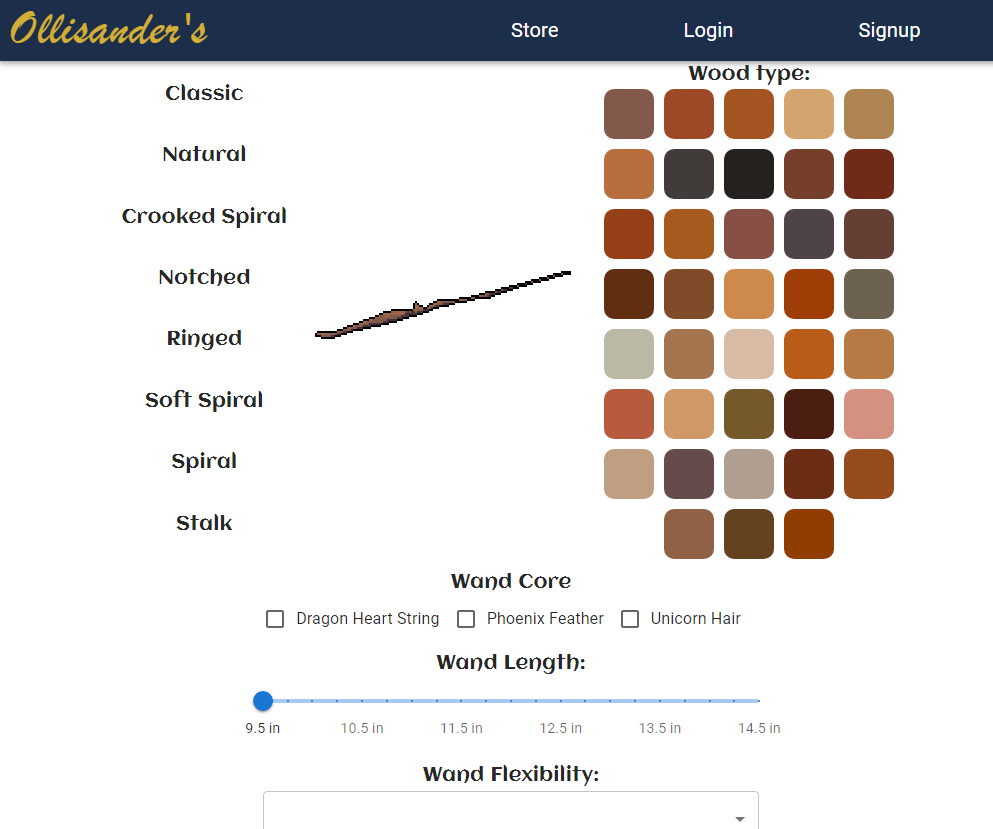 A wand store where a user can personalize their wand by style, color, length, core, and flexibility.